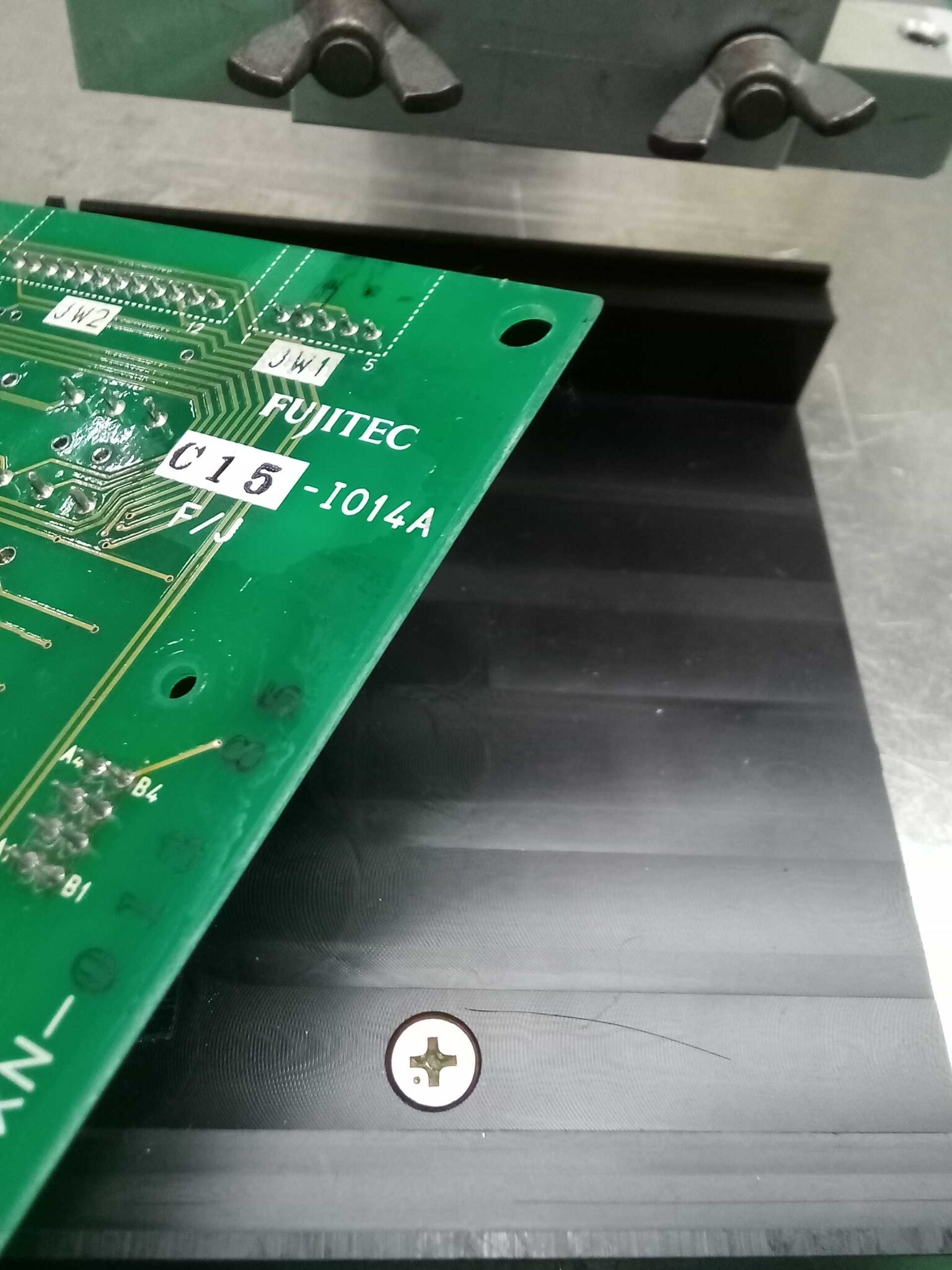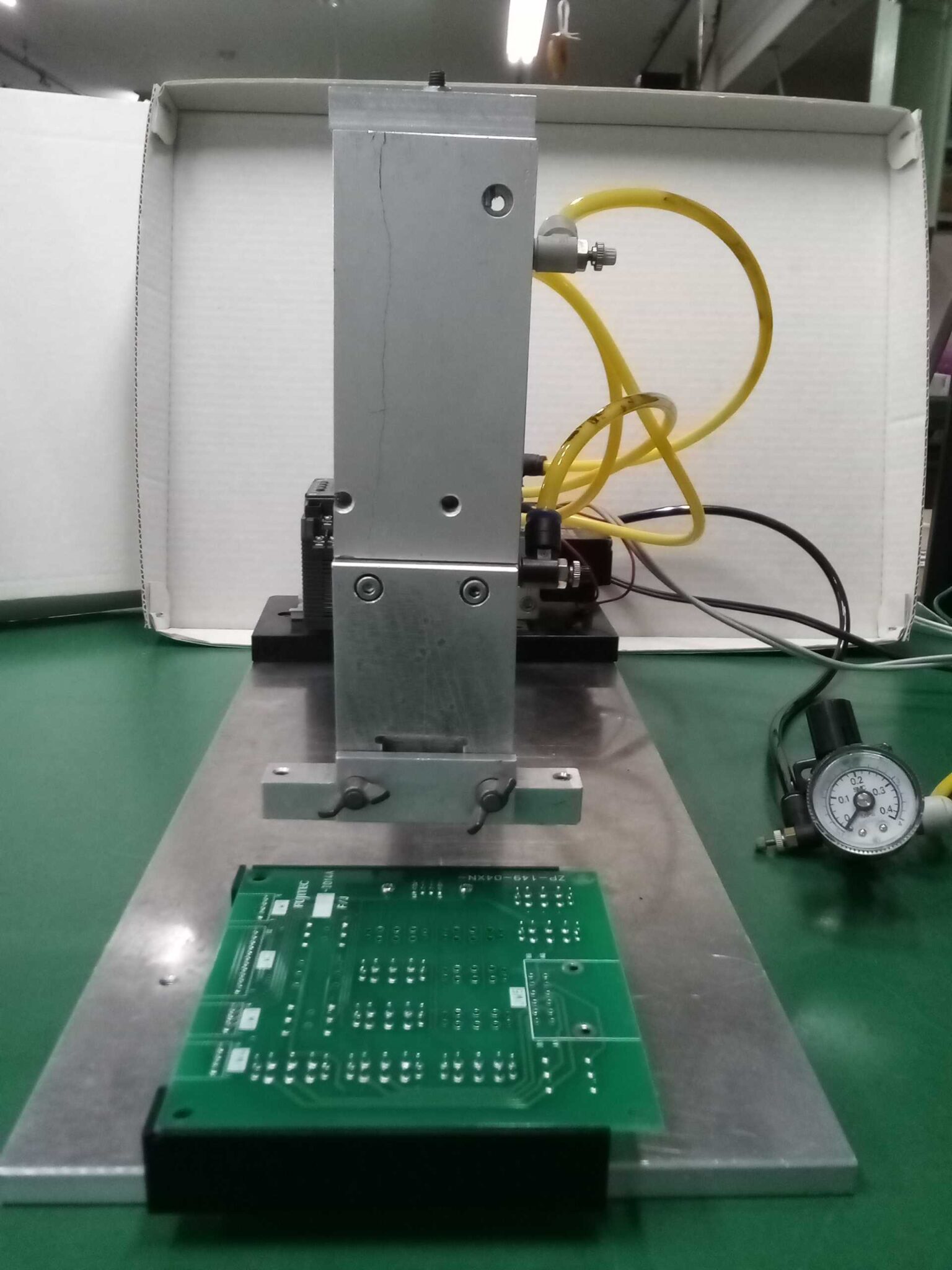 こちらの治具では基板をセットして足元のスイッチを踏むだけで誰でも同じ品質で捺印をすることができます。