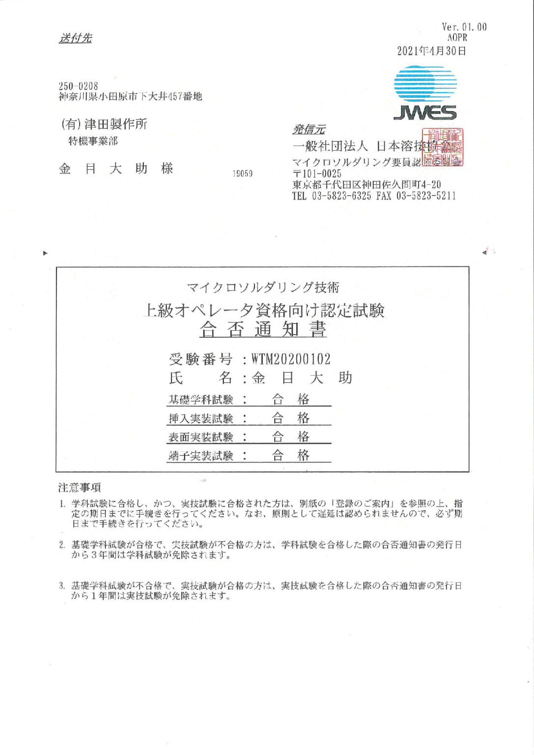 マイクロソルダリング技術の上級オペレータ資格に弊社社員が合格しました!
